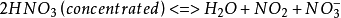 4、硝酸的氧化性與其濃度成正比。稀硝酸與金屬反應生成一氧化氮,濃硝酸與金屬反應同樣也會生成一氧化氮,但濃硝酸的氧化性比稀硝酸強,一氧化氮剛反應出來,就被硝酸根離子在氫離子存在的情況下氧化成二氧化氮。方程式如下: